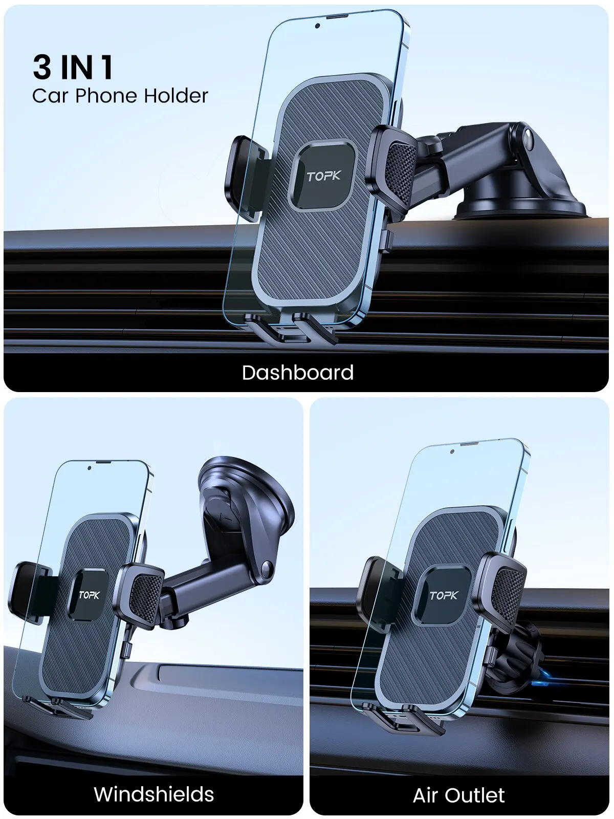 Keep your phone secure while driving with the TOPK Universal Gravity Car Phone Holder, designed for durability, wide compatibility, and ease of use across various installation types.