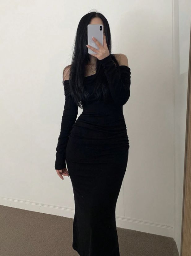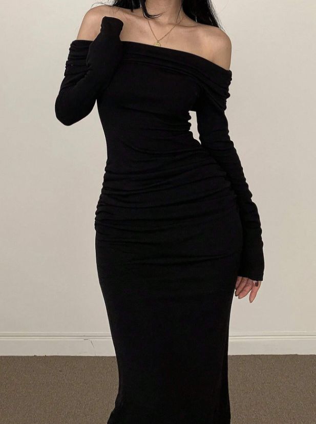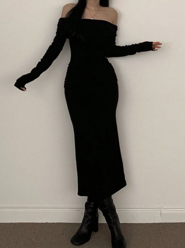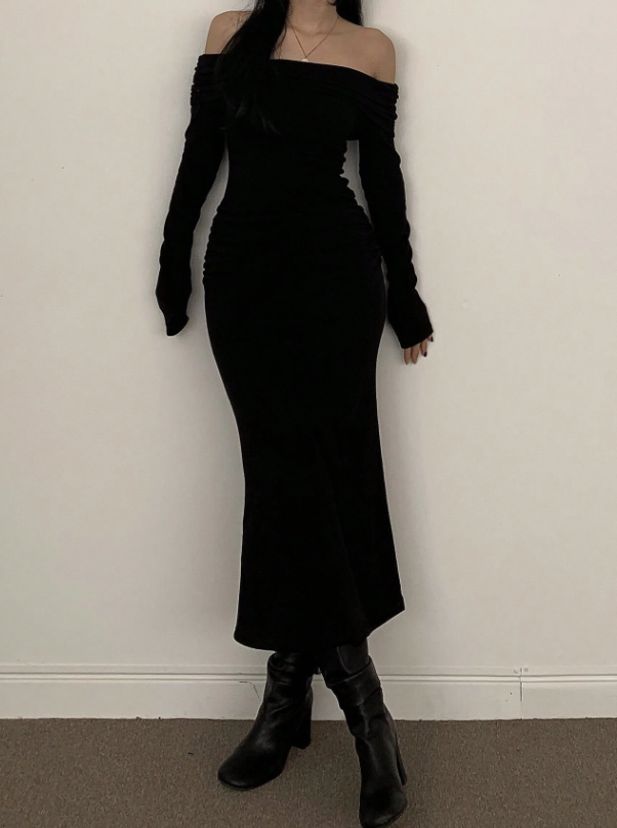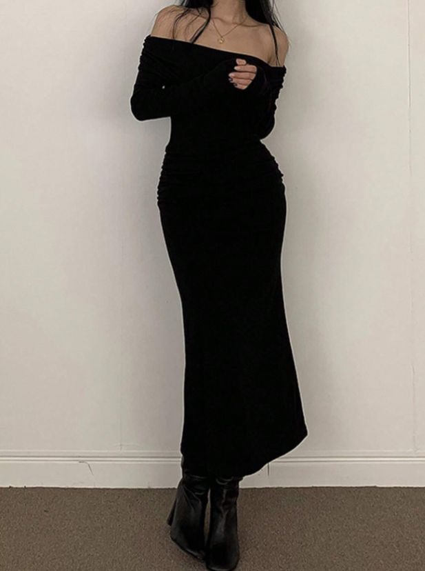 This off-shoulder long sleeve maxi dress combines modern elegance with a flattering, body-skimming silhouette. Designed with a folded turn-down collar neckline, it highlights the shoulders while maintaining a refined and stylish look.